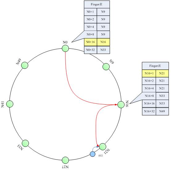 下图简单展示了从N0节点查找N21节点的一个数据的过程,通过finger表经过2跳到达目的地。